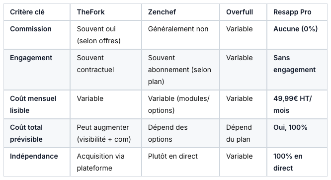 Si le critère n°1 est de rester indépendant, de ne payer aucune commission, et d’avoir un coût fixe bas sans engagement, alors Resapp Pro est la solution la plus avantageuse pour un restaurant : 49,99€ HT/mois, 0 commission, résiliable à tout moment.